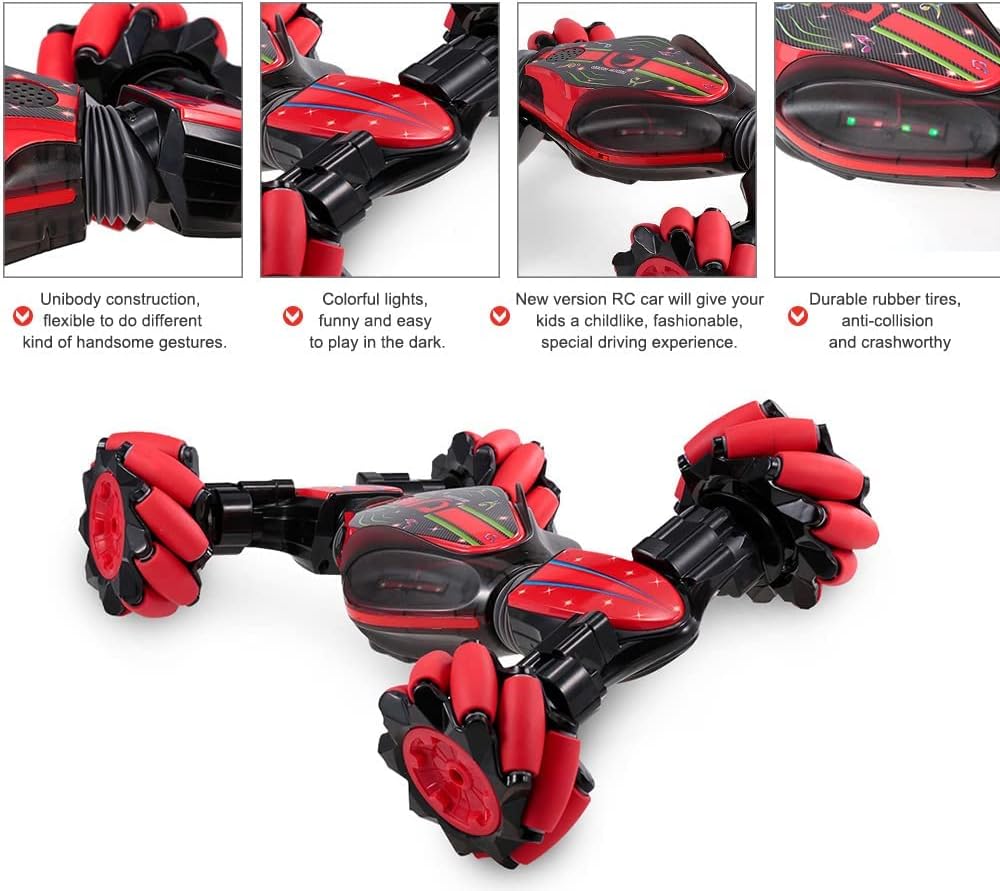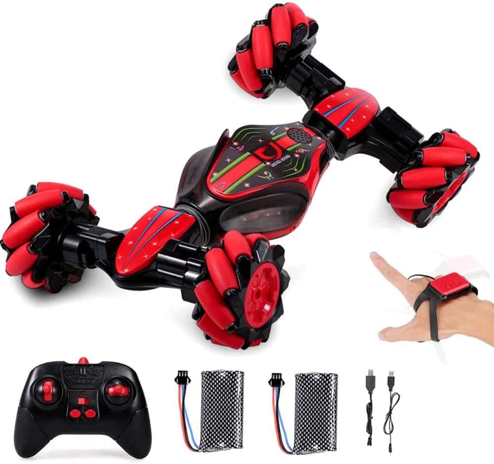Stunt Car RC Gesture Sensor Best Toy Gift high speed Offroad 4WD Transforming Deformable Climbing Twist Remote Control Vehicle with Music By PRIME TECH Specifications: Brand Name: Stunt RC Car Driving time: 45 Mins Charging time: 3-4 hours Body battery: 7.4V 1200 mAh lithium battery (included) Remote Controller Battery: 2 x AA batteries (Not included) Speed: 25 km/H RC Distance: Watch controller: 80-100m, Remote controller: 35m Color: Red Material: Strong ABS Size: 42*22*9.5 cm Package Includes: 1 x Stunt RC Car 1 x 7.4V 1200 mAh Battery 1 x Remote Controller 1 x Watch Controller 1 x USB Cable 1 x English User Manual